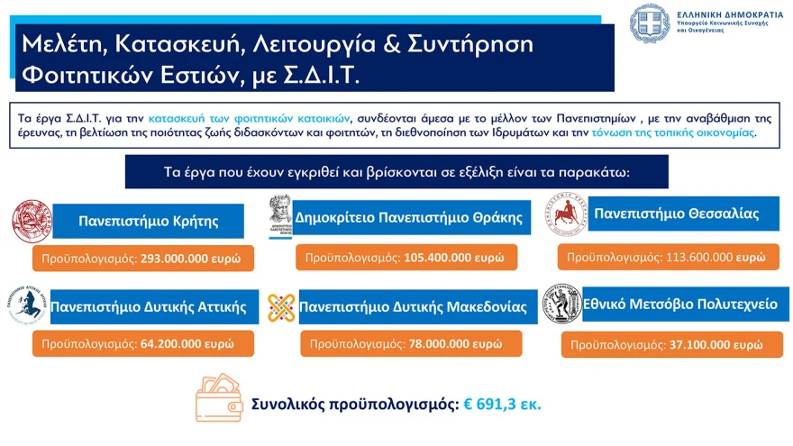 Τα έργα Σ.Δ.Ι.Τ. για την κατασκευή των φοιτητικών κατοικιών, συνδέονται άμεσα µε το μέλλον των Πανεπιστημίων , µε την αναβάθμιση της έρευνας, τη βελτίωση της ποιότητας ζωής διδασκόντων και φοιτητών, τη διεθνοποίηση των Ιδρυμάτων και την τόνωση της τοπικής οικονομίας.