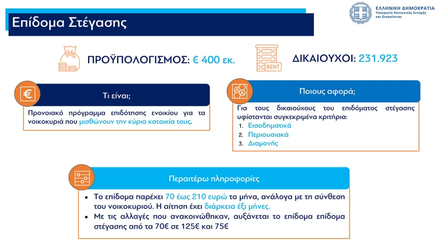 Το επίδοµα παρέχει 70 έως 210 ευρώ το µήνα, ανάλογα µε τη σύνθεση του νοικοκυριού. Η αίτηση έχει διάρκεια έξι µήνες. Με τις αλλαγές που ανακοινώθηκαν, αυξάνεται το επίδοµα επίδοµα στέγασης από τα 70 ευρώ σε 125 ευρώκαι 75 ευρώ.