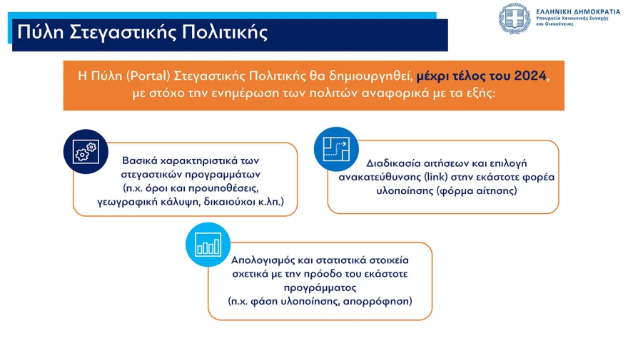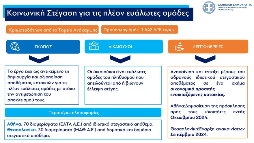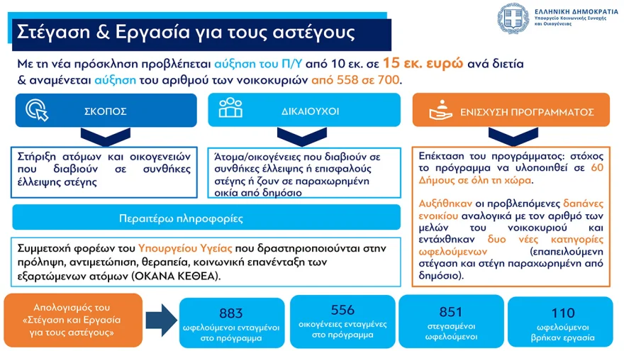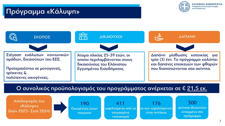 Επίσης για το πρόγραμμα «Κάλυψη» που προβλέπει τη στήριξη για τη στέγαση ευάλωτων κοινωνικών ομάδων και δικαιούχους ηλικίας από 25-39 ετών. Μέσω του προγράμματος καλύπτεται το ενοίκιο στους δικαιούχους έως 3 έτη.