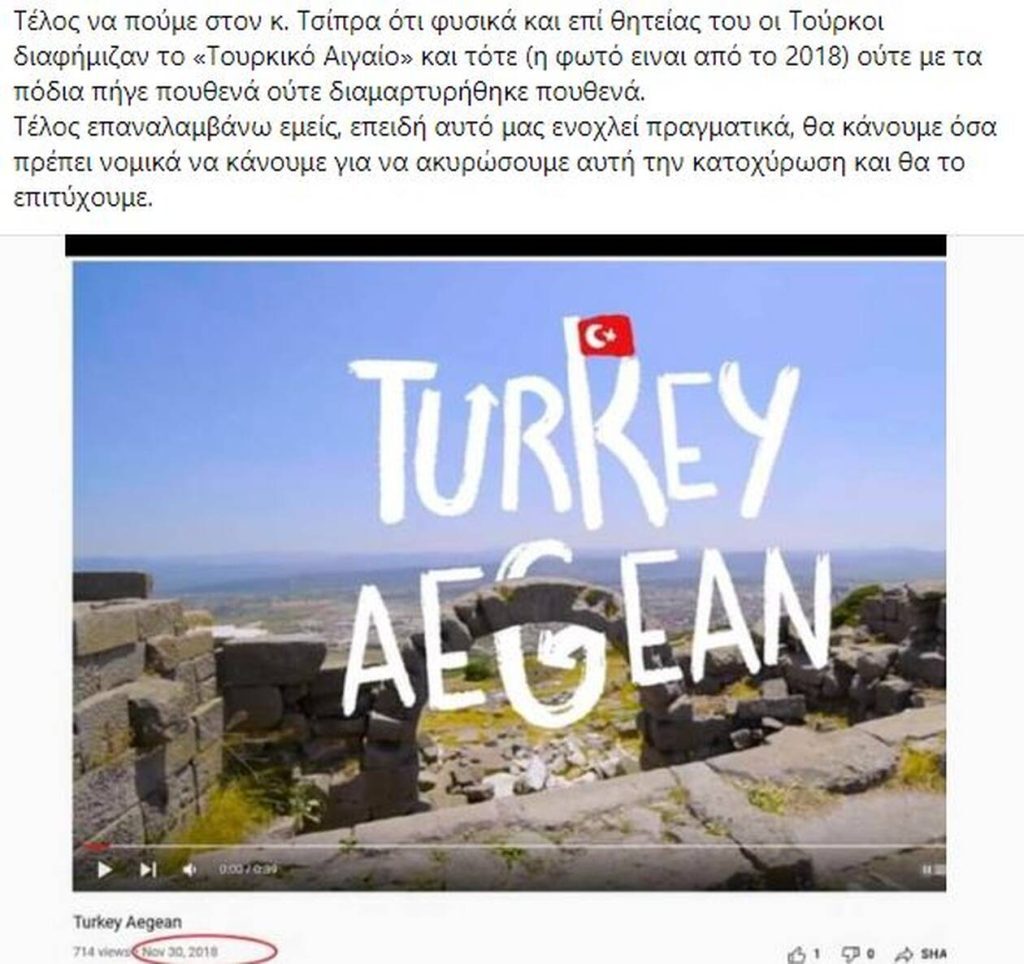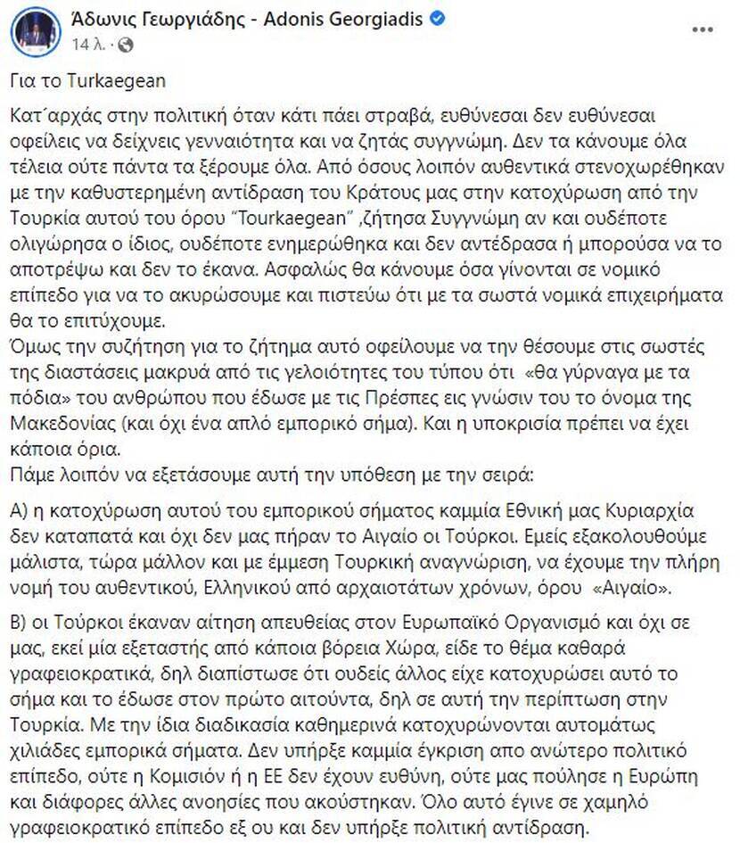 Ο Άδωνις Γεωργιάδης κλείνει την ανάρτησή του γράφοντας «τέλος να πούμε στον κ. Τσίπρα ότι φυσικά και επί θητείας του οι Τούρκοι διαφήμιζαν το «Τουρκικό Αιγαίο» και τότε (η φωτό ειναι από το 2018) ούτε με τα πόδια πήγε πουθενά ούτε διαμαρτυρήθηκε πουθενά. Τέλος επαναλαμβάνω εμείς, επειδή αυτό μας ενοχλεί πραγματικά, θα κάνουμε όσα πρέπει νομικά να κάνουμε για να ακυρώσουμε αυτή την κατοχύρωση και θα το επιτύχουμε».