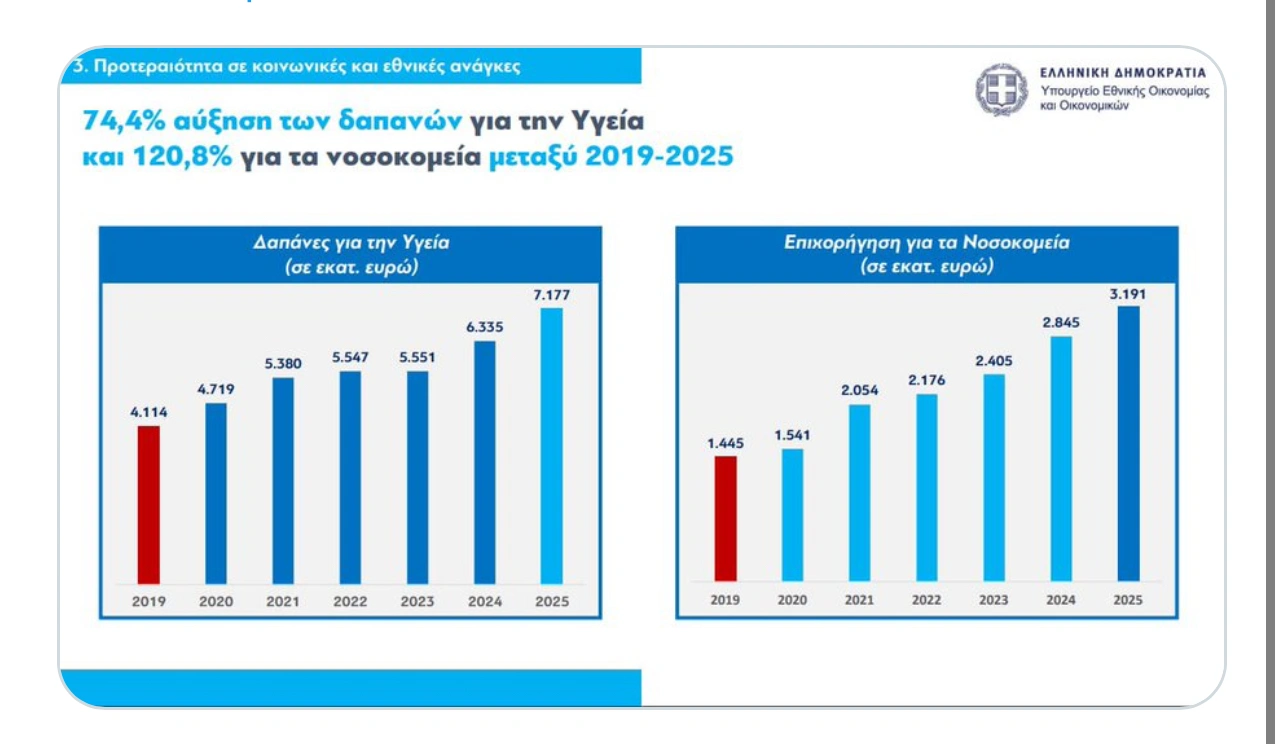 Λίγο αργότερα με ανάρτηση του στο X έγραψε: «Οι συνολικές δαπάνες για την Υγεία αναμένονται να ανέλθουν σε 7,1 δισ. ευρώ έναντι 6,3 δισ. ευρώ το 2024 και 5,5 δισ. ευρώ το 2023. Οι επιχορηγήσεις στα νοσοκομεία αναμένεται να ανέλθουν σε 3,2 δισ. ευρώ το 2025 έναντι 2,8 δισ. ευρώ το 2024 και 2,4 δισ. ευρώ το 2023. Την εξαετία 2019 – 2025 καταγράφηκε αύξηση των δαπανών για την Υγεία κατά 74,4% και κατά 120,8% για τα νοσοκομεία».