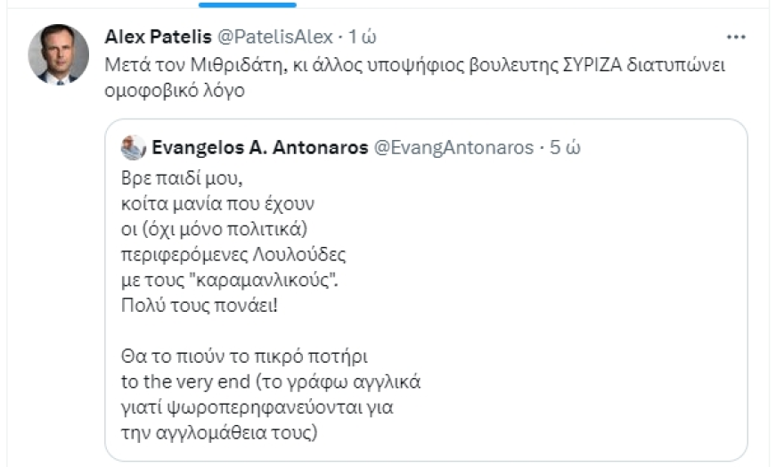 την αγγλομάθεια τους)», λέγοντας: «Μετά τον Μιθριδάτη κι άλλος υποψήφιος βουλευτής του ΣΥΡΙΖΑ διατυπώνει ομοφοβικό λόγο».