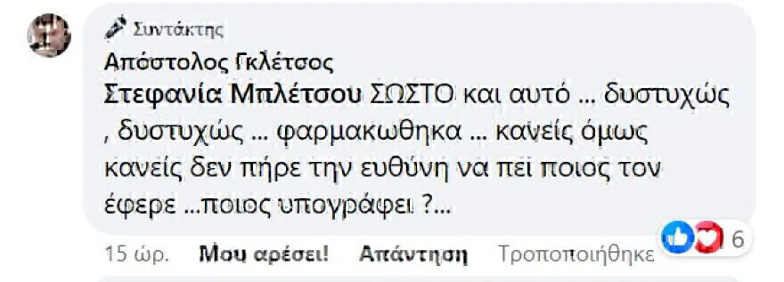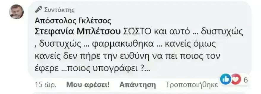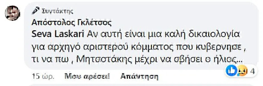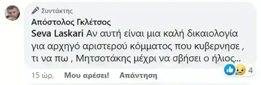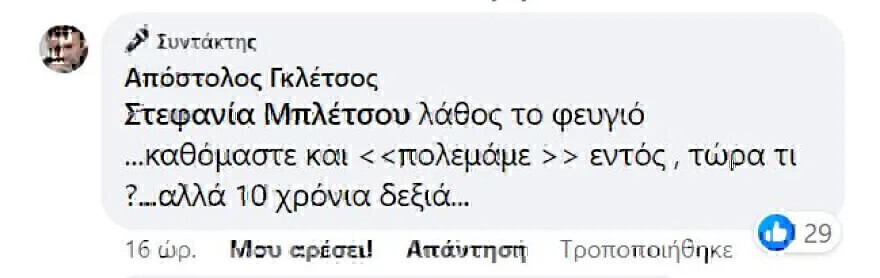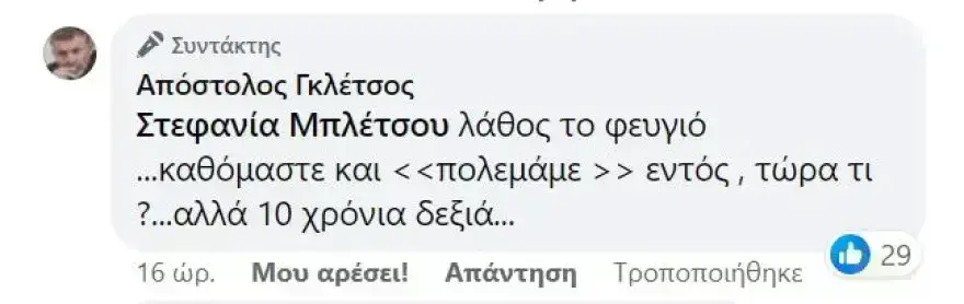 Απαντώντας, δε, σε φίλη του η οποία έχει αποχωρήσει από τον ΣΥΡΙΖΑ, ο πρώην δήμαρχος Στυλίδας αν και χαρακτηρίζει «λάθος το φευγιό, καθόμαστε και πολεμάμε εντός» στη συνέχεια αναρωτιέται «τώρα τι; άλλα 10 χρόνια δεξιά» για να προσθέσει σε άλλο σχόλιο «ξεφτίλα για όλους μας, τελειώσαμε».