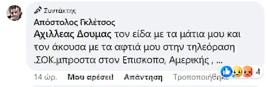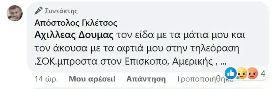 Στον διάλογο στον «τοίχο» του κ. Γκλέτσου τέθηκε και όσα είπε ο πρόεδρος του ΣΥΡΙΖΑ για το «θαύμα» στη βάπτισή του, με τον Απόστολο Γκλέτσο να σχολιάζει «τον είδα με τα μάτια μου και τον άκουσα με τα αφτιά μου στην τηλεόραση. ΣΟΚ μπροστά στον Επισκοπο, Αμερικής».