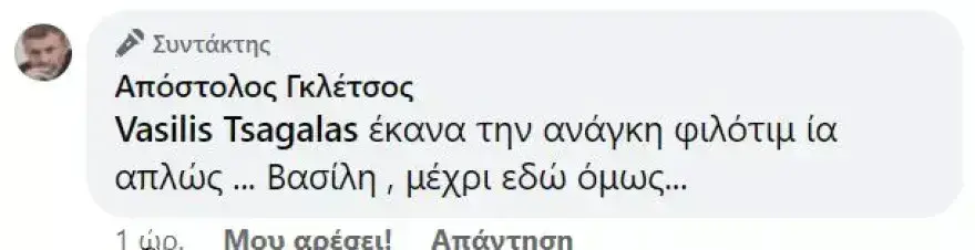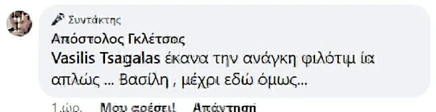 Στη συνέχεια ο Απόστολος Γκλέτσος απάντησε και σε κριτική που του ασκήθηκε για τη στήριξη στον Στέφανο Κασσελάκη γράφοντας «έκανα την ανάγκη φιλοτιμία απλώς Βασίλη, μέχρι εδώ όμως…».