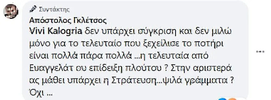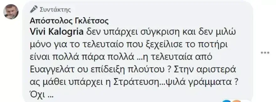 Όταν, στη συνέχεια, συνομιλητής του αναφέρθηκε στον Αλέξη Τσίπρα και τις αναφορές που έκανε ο πρώην πρόεδρος του ΣΥΡΙΖΑ σε θέματα θρησκείας, ο Απόστολος Γκλέτσος γράφει «δεν υπάρχει σύγκριση και δεν μιλώ μόνο για το τελευταίο που ξεχείλισε το ποτήρι είναι πολλά πάρα πολλά… η τελευταία από Ευαγγελάτου επίδειξη πλούτου. Στην αριστερά ας μάθει υπάρχει η Στράτευση…ψιλά γράμματα; Όχι».