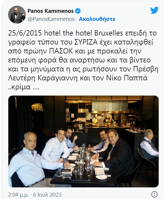 Με μία ανάρτηση στο Twitter, ο Πάνος Καμμένος απαντά στον ΣΥΡΙΖΑ. Συγκεκριμένα ο Πάνος Καμμένος δημοσίευσε φωτογραφία στην οποία εμφανίζεται ο ίδιος στο εστιατόριο «The Restaurant by Pierre Balthazar» με τον Αλέξη Τσίπρα, τον Νίκο Παππά και τον Γαβριήλ Σακελλαρίδη. Κατά δήλωσή του όπως είπε στη συνέντευξη στον ΑΝΤ1 η συγκεκριμένη συνάντηση έγινε στις 25 Ιουνίου 2015 δηλαδή την ημέρα του κρίσιμου Eurogroup μετά το ελληνικό δημοψήφισμα.