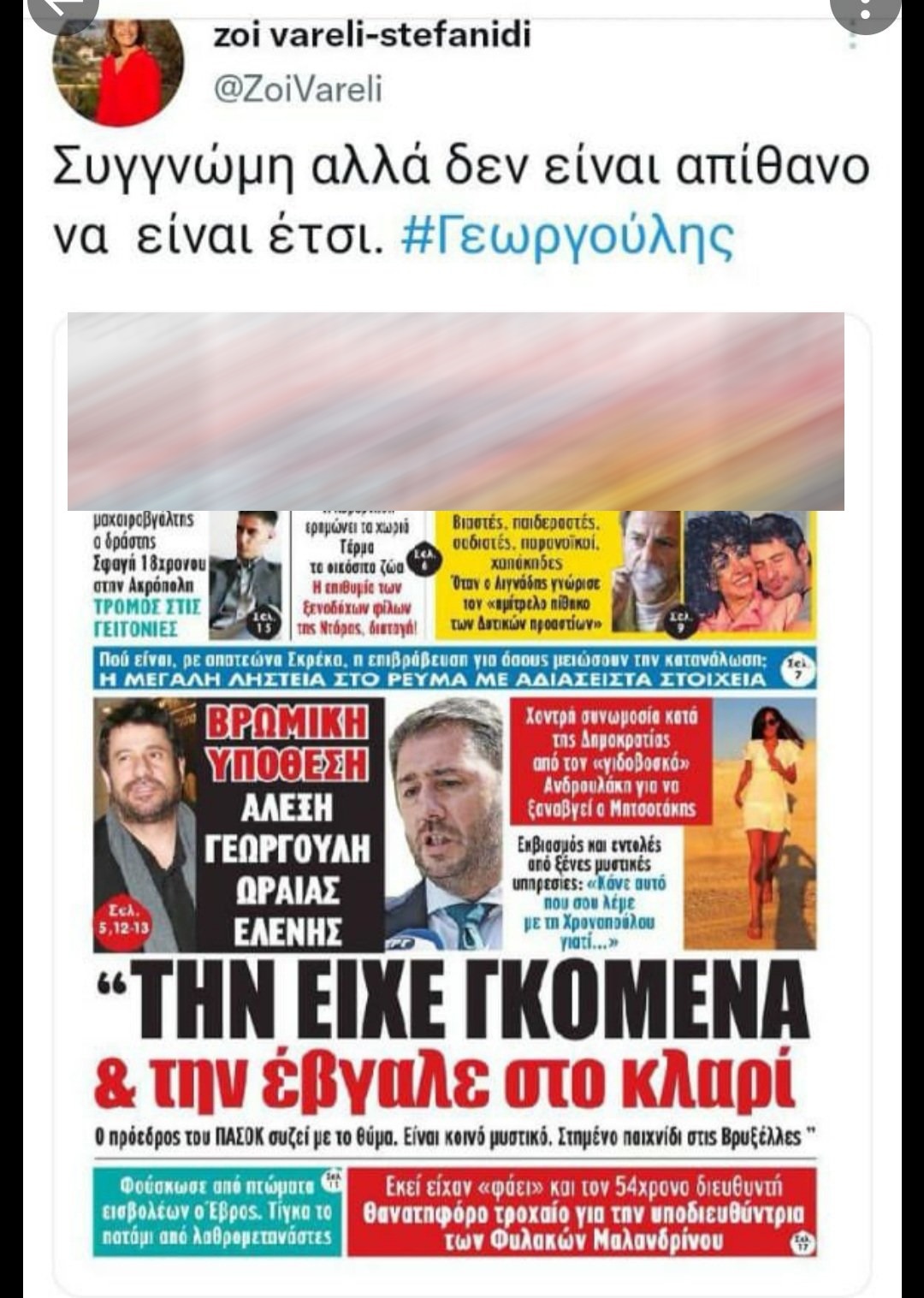 Ο λόγος είχε να κάνει με την ανάρτηση της μητέρας της Ζωή Βαρέλη – Στεφανίδη, η οποία είναι υποψήφια βουλευτής του ΣΥΡΙΖΑ – ΠΣ στην Ανατολική Αττική, υιοθετώντας το, χυδαίο πρωτοσέλιδο, το οποίο αναφέρεται στην υπόθεση της καταγγελίας της Ελένης Χρονοπούλου σε βάρος του Αλέξη Γεωργούλη. Όπως άλλωστε ανέφερε η ανάρτησή της: «Συγγνώμη, αλλά δεν είναι απίθανο να είναι έτσι».