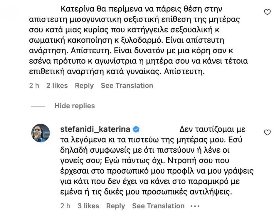 Παρόμοιο σχόλιο δέχθηκε και στον προσωπικό της λογαριασμό στο Instagram, όπου χρήστης απευθυνόμενος στην πρωταθλήτρια έγραψε: «Κατερίνα θα περίμενα να πάρεις θέση στην απίστευτη μισογυνιστική σεξιστική επίθεση της μητέρας σου κατά μιας κυρίας που κατήγγειλε σεξουαλική και σωματική κακοποίηση και ξυλοδαρμό. Είναι απίστευτη ανάρτηση. Απίστευτη. Είναι δυνατόν με μια κόρη σαν και εσένα, πρότυπο και αγωνίστρια, η μητέρα σου να κάνει τέτοια επιθετική ανάρτηση κατά γυναίκας. Απίστευτη».