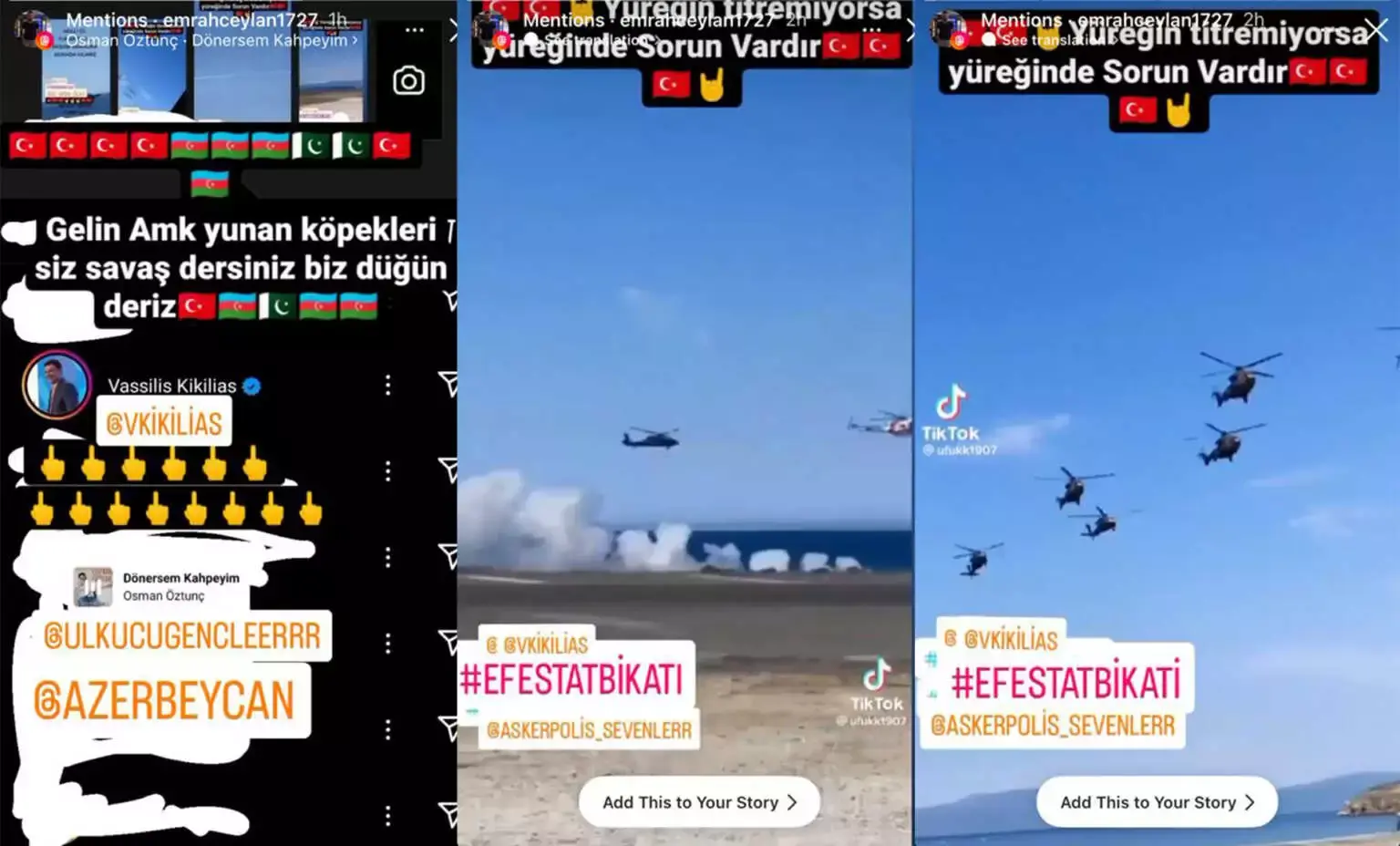 Προηγήθηκαν απειλές εναντίον του Έλληνα υπουργού Τουρισμού από Τούρκους οι οποίοι κατέκλυσαν τον λογαριασμό του στο Instagram. Η διαδικτυακή επίθεση εξαπολύθηκε από λογαριασμούς στην Τουρκία στον προσωπικό λογαριασμό του Υπουργού Τουρισμού στο Instagram με υβριστικά σχόλια τόσο για τον Βασίλη Κικίλια προσωπικά, όσο και για τη χώρα μας. Γράφουν μεταξύ άλλων: «Ελάτε γ#%@ ελληνικά σκυλιά. Εσείς το λέτε πόλεμο, εμείς το λέμε “γάμο”».