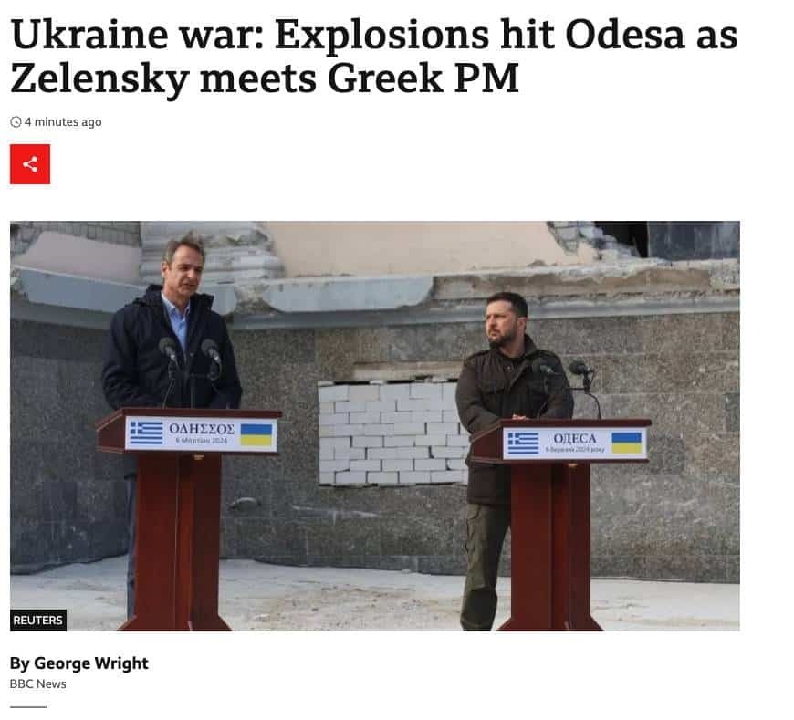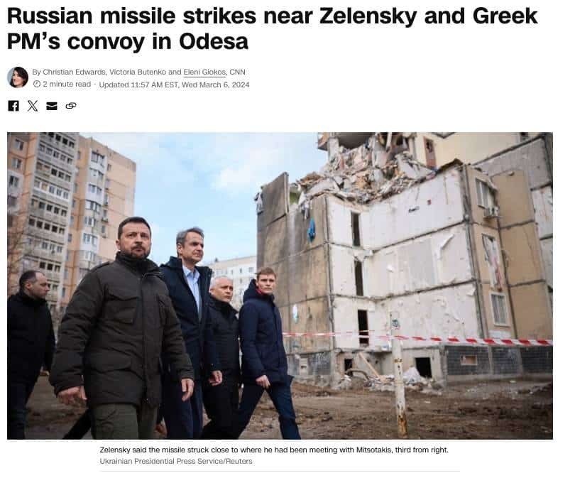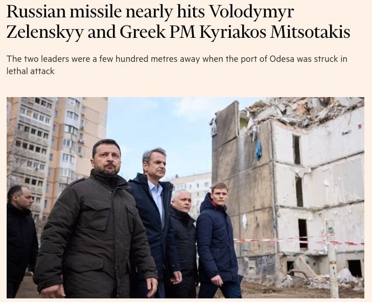 «Ένα ρωσικό πυραυλικό πλήγμα σημειώθηκε κοντά στην αυτοκινητοπομπή του Ζελένσκι στην πόλη της Οδησσού, όπου ο πρόεδρος συναντιόταν με τον Έλληνα πρωθυπουργό, Κυριάκο Μητσοτάκη».