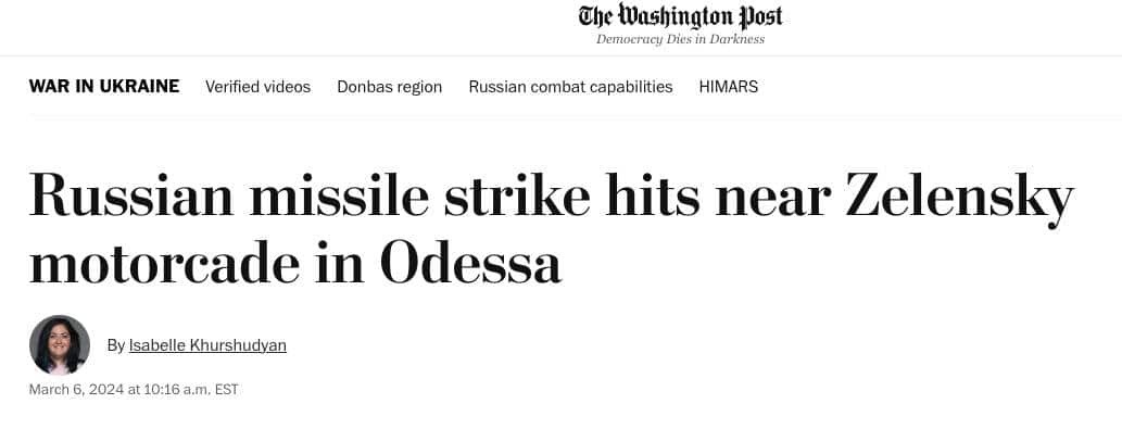 H Washington Post δημοσίευσε άρθρο με τίτλο «Ρωσικός πύραυλος χτυπά κοντά στην αυτοκινητοπομπή του Ζελένσκι στην Οδησσό».