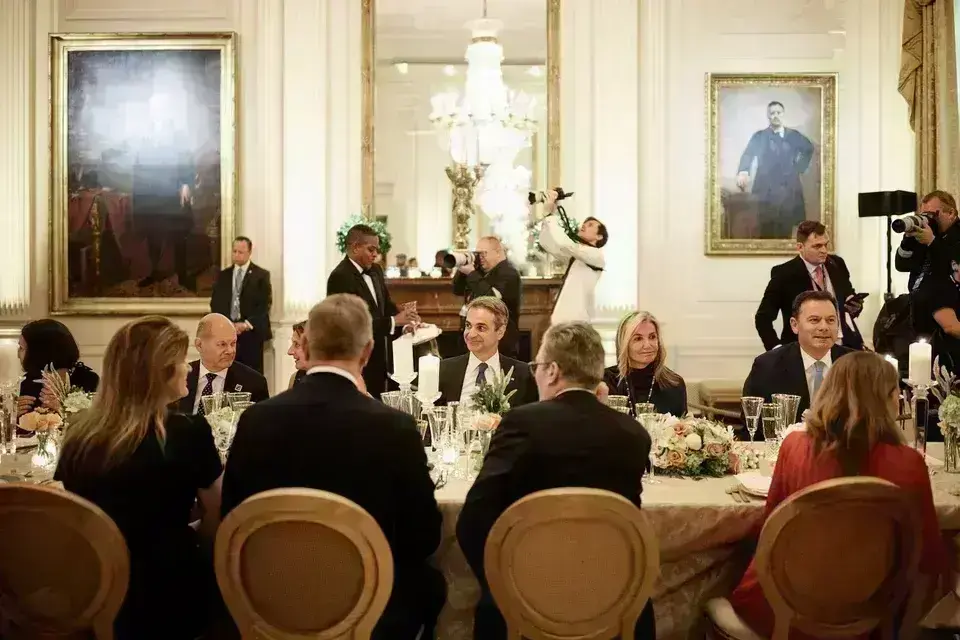 Το δείπνο ξεκίνησε αμέσως μετά τη συνάντηση του Κυριάκου Μητσοτάκη με τον Ρετζέπ Ταγίπ Ερντογάν και για τον λόγο αυτό ο πρωθυπουργός αποχώρησε σχεδόν τρέχοντας προκειμένου να μην καθυστερήσει η άφιξή του στον Λευκό Οίκο. Ο Κυριάκος Μητσοτάκης όπως θα δείτε στις φωτογραφίες κάθισε δίπλα στο ζεύγος Σολτς.