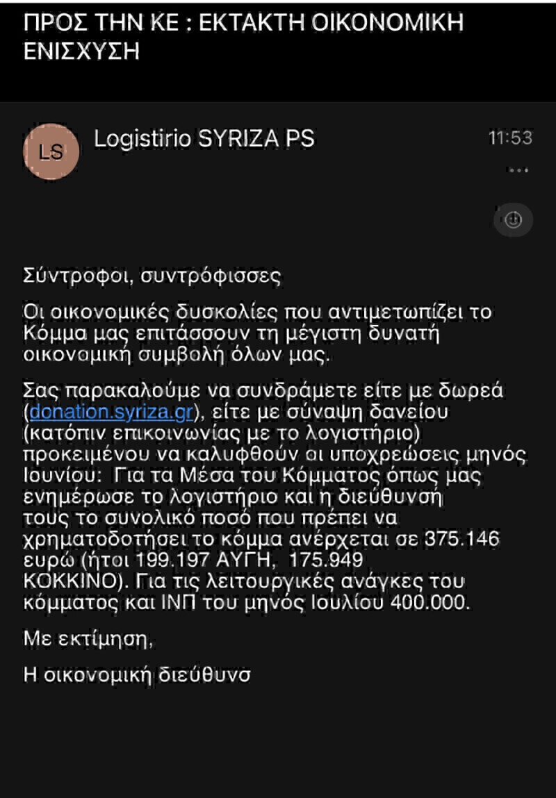 Οι οικονομικές δυσκολίες που αντιμετωπίζει το Κόμμα μας επιτάσσουν τη μέγιστη δυνατή οικονομική συμβολή όλων μας. Σας παρακαλούμε να συνδράμετε είτε με δωρεά (donation.syriza.gr), είτε με σύναψη δανείου (κατόπιν επικοινωνίας με το λογιστήριο) προκειμένου να καλυφθούν οι υποχρεώσεις μηνός Ιουνίου για τα Μέσα του Κόμματος, συνολικού ύψους 375.146 ευρώ (ήτοι 199.197 ΑΥΓΗ, 175.949 ΚΟΚΚΙΝΟ).