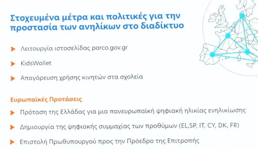 Η εθνική μας πρωτοβουλία μπορεί να αποτελέσει πρότυπο για αυτή τη ευρύτερη ευρωπαϊκή λύση. Το “KidsWallet” είναι μια καινοτόμος εφαρμογή, εκδιδόμενη από το κράτος, η οποία επιτρέπει στους γονείς να θέτουν σαφή όρια στη χρήση εφαρμογών, ενώ παράλληλα καθιερώνει μια ασφαλή και αξιόπιστη διαδικασία επαλήθευσης ηλικίας, διασφαλίζοντας ότι τα παιδιά εκτίθενται μόνο σε περιεχόμενο κατάλληλο για την ηλικία τους. Ήδη είναι διαλειτουργική με τον ευρωπαϊκό μηχανισμό επαλήθευσης ηλικίας.