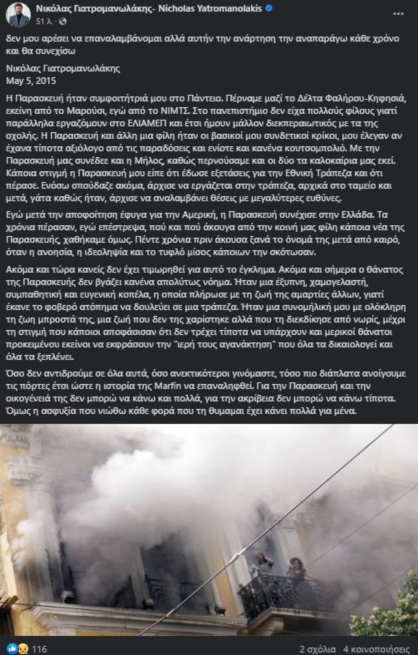 Όσο δεν αντιδρούμε σε όλα αυτά, όσο ανεκτικότεροι γινόμαστε, τόσο πιο διάπλατα ανοίγουμε τις πόρτες έτσι ώστε η ιστορία της Marfin να επαναληφθεί. Για την Παρασκευή και την οικογένειά της δεν μπορώ να κάνω και πολλά, για την ακρίβεια δεν μπορώ να κάνω τίποτα. Όμως η ασφυξία που νιώθω κάθε φορά που τη θυμάμαι έχει κάνει πολλά για μένα».