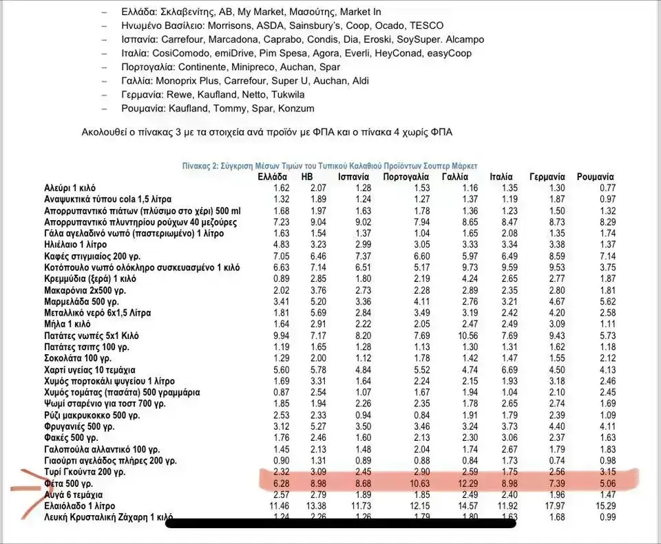 «Στο ζήτημα της φέτας, πριν βγάλουν ανακοίνωση στον ΣΥΡΙΖΑ, δεν μπήκαν καν στον κόπο να διαβάσουν το έγγραφο που κατέθεσε ο Πρωθυπουργός στη Βουλή. Αν το έκαναν, θα αντιλαμβάνονταν ότι συνέκρινε τις τιμές μεταξύ ιδίων ποσοτήτων στην Ελλάδα και σε άλλες ευρωπαϊκές χώρες. Το παραθέτουμε εκ νέου (φωτό 1) μήπως και το καταλάβουν. Μάλιστα, το πιο εντυπωσιακό είναι ότι στις εικόνες που οι ίδιοι παρέθεσαν στη σημερινή ανακοίνωσή τους, εμφανίζονται κωδικοί με ακόμα χαμηλότερες τιμές κιλού (9,88 ευρώ το ένα κιλό) από την τιμή που αναφερόταν για την Ελλάδα στον πίνακα που κατέθεσε ο Πρωθυπουργός σήμερα στη Βουλή (6,28 ευρώ το μισό κιλό).