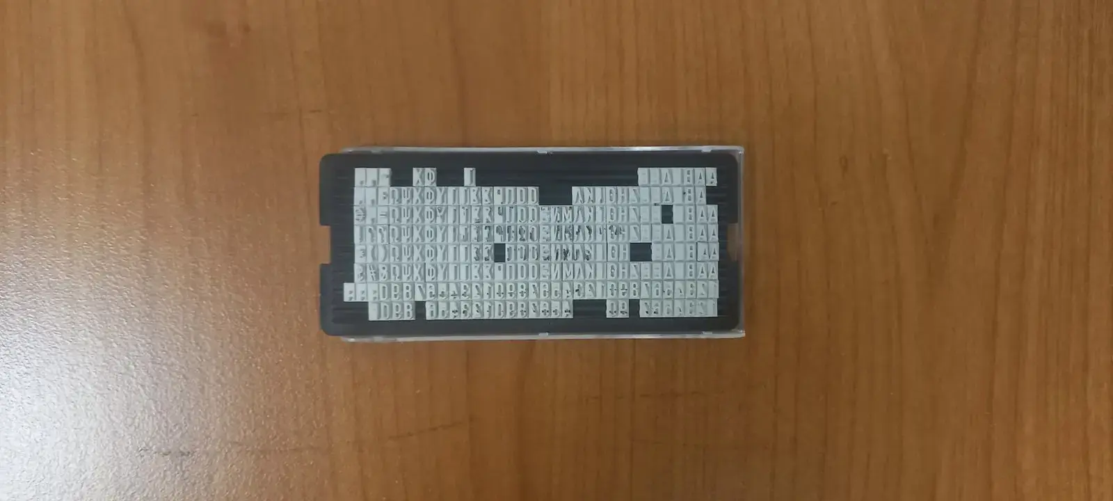 - πλακέτα/μήτρα σφραγίδας αποτελούμενη από αποσπώμενους αριθμούς, ελληνικά γράμματα, σημεία στίξης και σύμβολα,