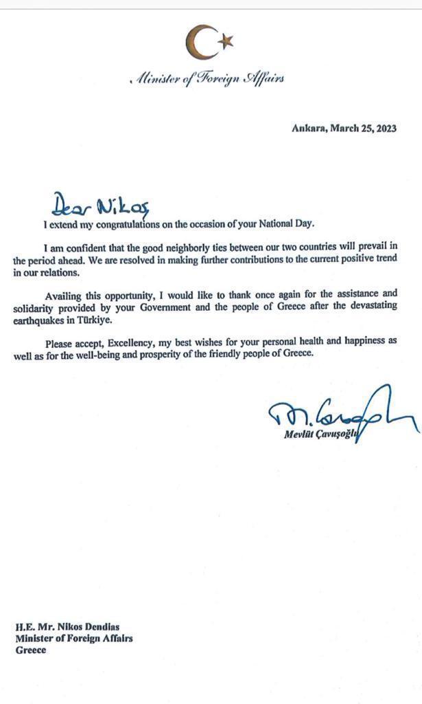 Συγκεκριμένα στην επιστολή του ο Τούρκος Υπουργός Εξωτερικών, εκτός από τις ευχές για την 25η Μαρτίου, σημειώνει πως είναι βέβαιος ότι οι σχέσεις καλής γειτονίας οι οποίες υφίστανται αυτή τη στιγμή μεταξύ Ελλάδος και Τουρκίας θα παγιωθούν στο μέλλον.