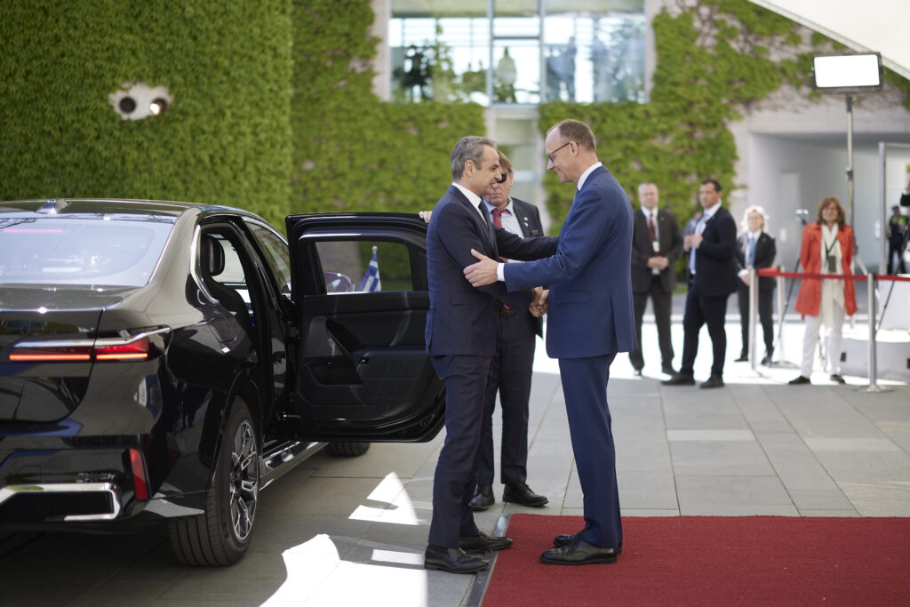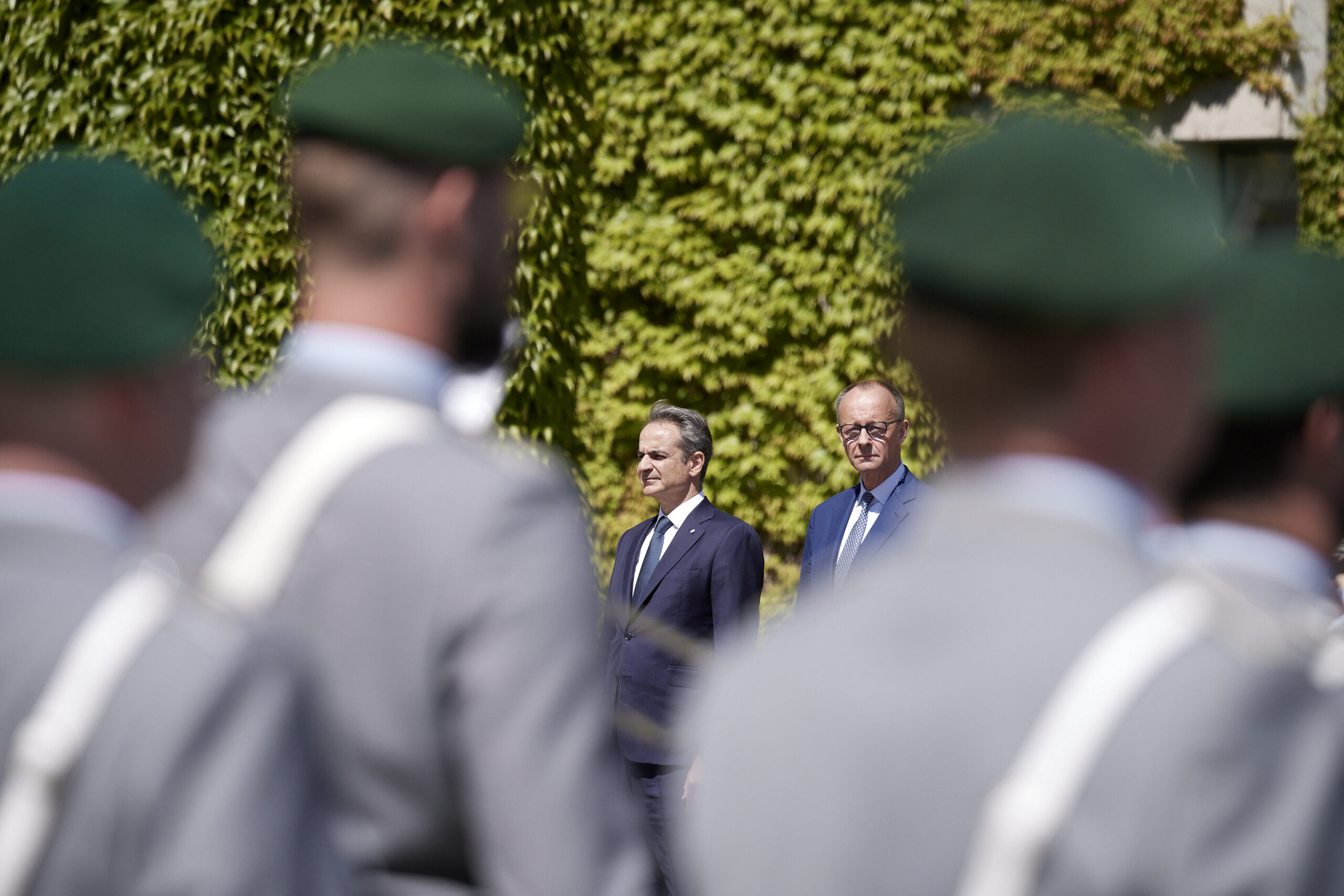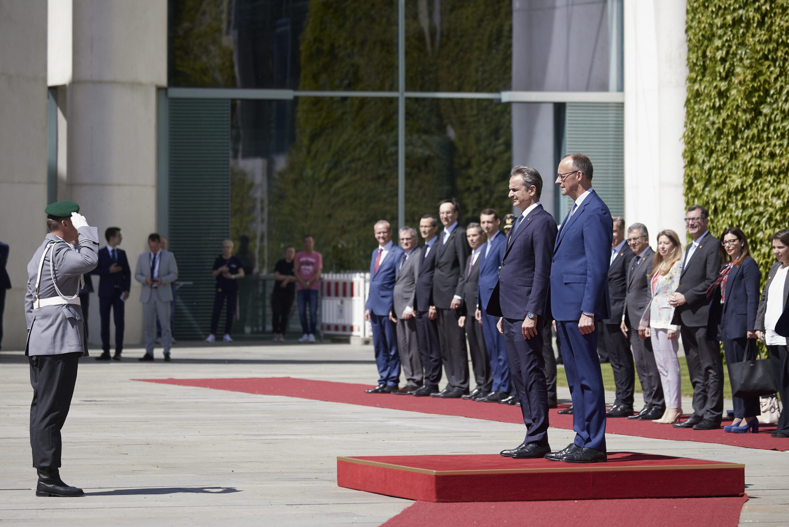 Ο κ. Μητσοτάκης έγινε δεκτός με στρατιωτικές τιμές, ενώ είναι ο πρώτος ηγέτης που υποδέχεται ο νέος καγκελάριος από την ανάληψη των καθηκόντων του.