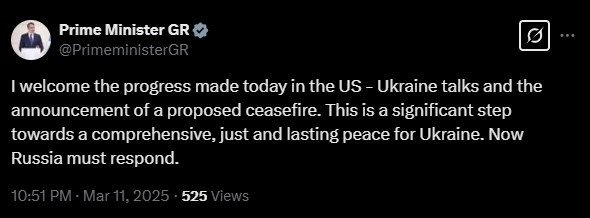 «Χαιρετίζω την πρόοδο που σημειώθηκε σήμερα στις συνομιλίες ΗΠΑ-Ουκρανίας και την ανακοίνωση μιας προτεινόμενης εκεχειρίας. Πρόκειται για ένα σημαντικό βήμα προς μια συνολική, δίκαιη και διαρκή ειρήνη για την Ουκρανία. Τώρα η Ρωσία πρέπει να ανταποκριθεί», ήταν η πρώτη αντίδραση του Έλληνα πρωθυπουργού, Κυριάκου Μητσοτάκη στην συμφωνία που έκλεισε στη Τζέντα το βράδυ της Τρίτης (11/3).