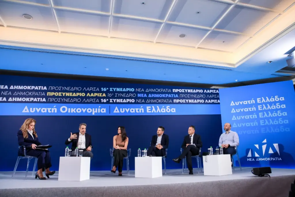 Ο Κυριάκος Μητσοτάκης στο προσυνέδριο της Λάρισας συνομίλησε με τη κα Ράνια Λάμπρου που είναι συνιδρύτρια εταιρείας τεχνολογίας, τον κ. Γιώργο Ρωμανόπουλο που είναι αγρότη, τον κ. Ευάγγελο Γκάγκο Πρόεδρο εταιρειών κατασκευών και βιομηχανικής παραγωγής και τον κ. Αλέξανδρο Φίδης Μηχανικό Συστημάτων Πληροφορικής. Ο πρωθυπουργός ανέφερε πως έχει ξεχωριστή σημασία ότι «επιλέγουμε να μιλήσουμε για τη δυνατή οικονομία και τη δυνατή Ελλάδα στη Θεσσαλία που έχει δοκιμαστεί από τις φυσικές καταστροφές και έχει πλεονεκτήματα ώστε τα επόμενα χρόνια να απογειωθεί».