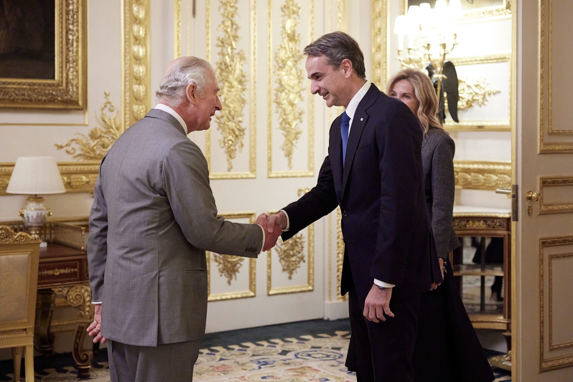 Η συνάντηση, στην οποία ο Πρωθυπουργός συνοδευόταν από τη σύζυγό του Μαρέβα Γκραμπόφσκι Μητσοτάκη, διεξήχθη σε θερμό κλίμα.