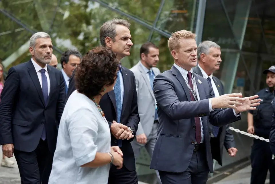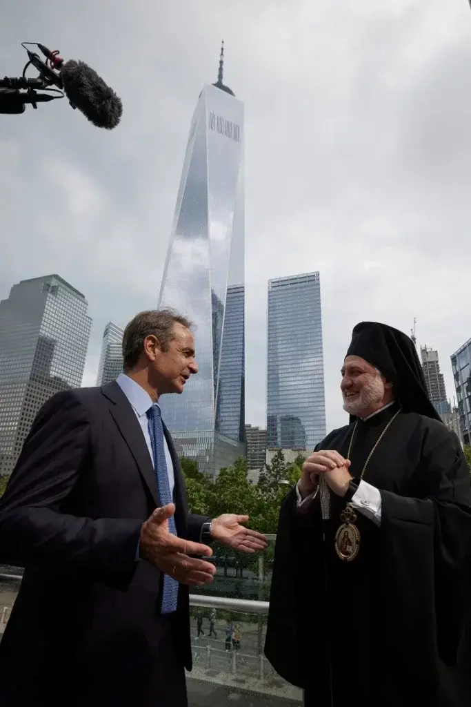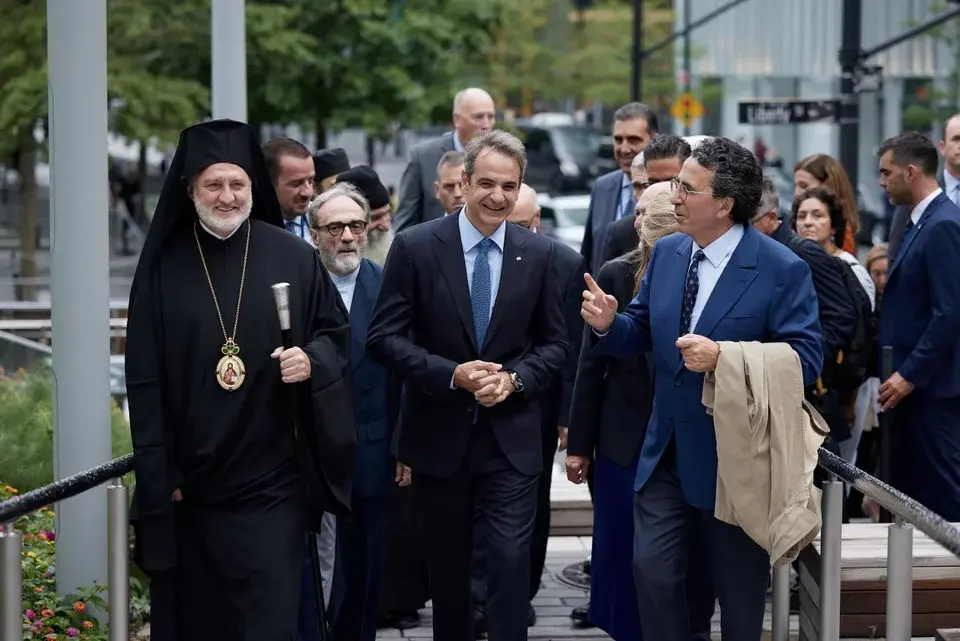 Τον Κυριάκο Μητσοτάκη και τη σύζυγό του υποδέχτηκε ο Αρχιεπίσκοπος Αμερικής κ. Ελπιδοφόρος, ο οποίος τους ξενάγησε στον χώρο, ενώ ο αρχιτέκτονας που έχει σχεδιάσει τον νέο ναό, Σαντιάγο Καλατράβα, εξήγησε το σχέδιο έως την τελική περάτωση του έργου.