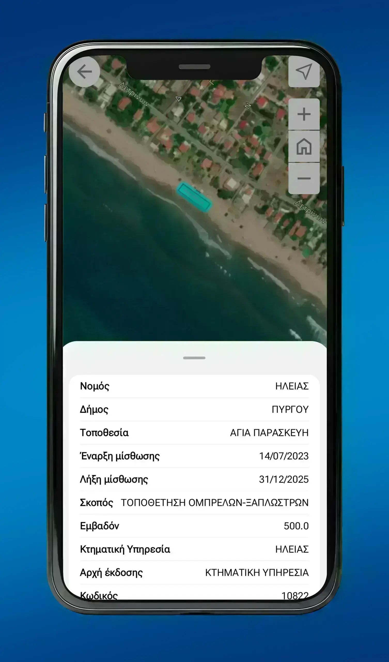 - Εντοπίζουν την περιοχή ενδιαφέροντος τους στο χάρτη και εμφανίζεται στην οθόνη της συσκευής τους το πολύγωνο της παραχώρησης.