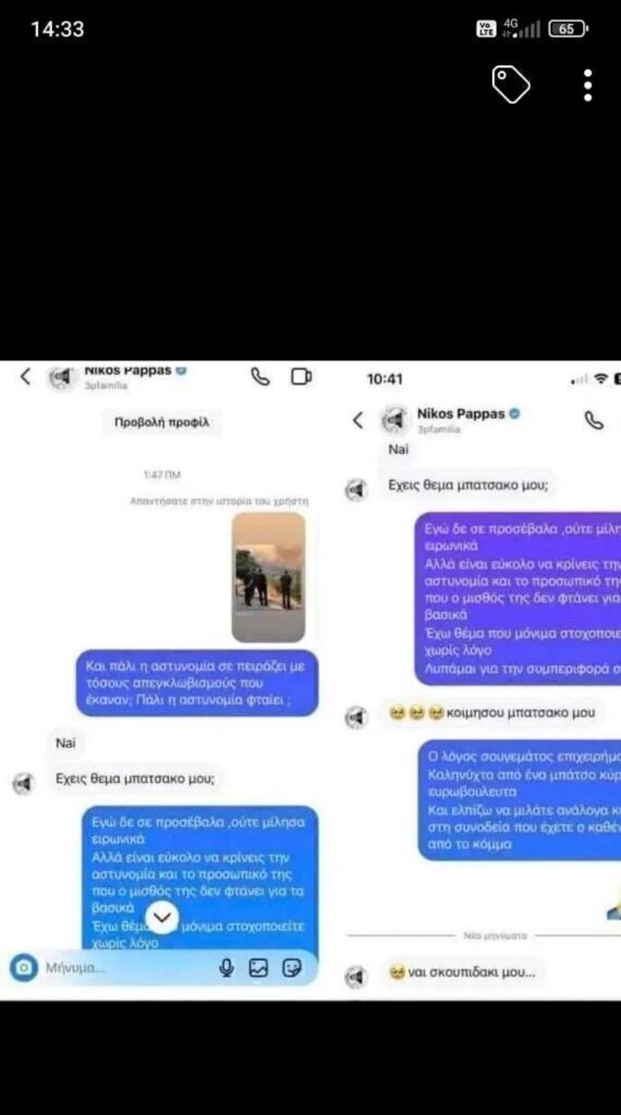 Υπενθυμίζεται ότι σε συνομιλία που φέρεται να είχε μέσω των social media ο Νίκος Παππάς με αστυνομικό, φέρεται να εξαπέλυσε ύβρεις κατά του κλάδου. Παράλληλα, σε ηχητικό που κυκλοφόρησε στο διαδίκτυο φέρεται να ακούγεται να λέει στο άτομο με το οποίο συνομιλεί μέσω μηνυμάτων: «Καλό ψόφο σε ό,τι αγαπάς».