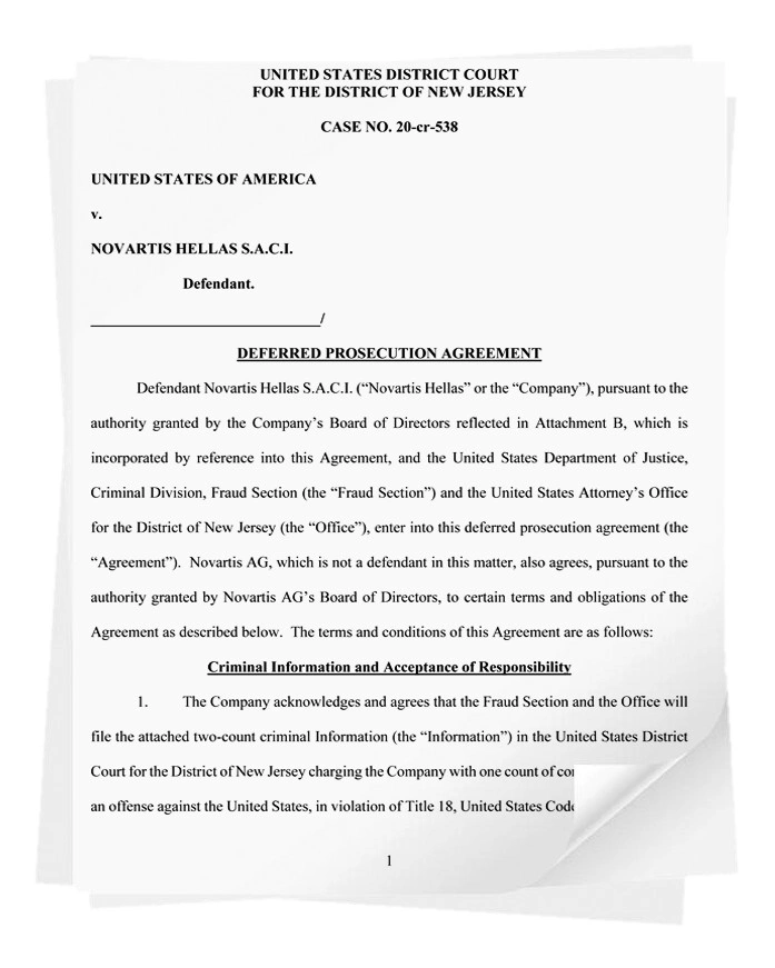 «H Novartis Hellas, μέσω των εργαζομένων και των εντεταλμένων της, εν γνώσει της και εκούσια συνωμότησε και συμφώνησε να δωροδοκήσουν υπαλλήλους δημόσιων νοσοκομείων και κλινικών με σκοπό την απόκτηση αθέμιτου πλεονεκτήματος και αύξηση των πωλήσεων της επωνυμίας Novartis για συνταγογραφούμενα φάρμακα στην Ελλάδα. Συγκεκριμένα, η Novartis Hellas χρηματοδότησε γιατρούς ελληνικών νοσοκομείων και κλινικών ώστε να συμμετέχουν σε διεθνή συνέδρια ως μέσο δωροδοκίας και διαφθοράς για να τους επηρεάσουν να αυξήσουν τη συνταγογράφηση» τονίζεται στα αμερικανικά έγγραφα.