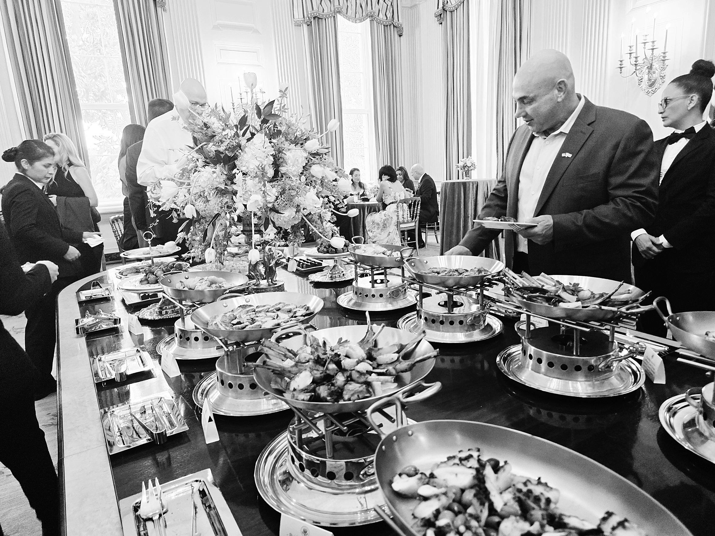 Η γιορτή για την Ελληνική Ημέρα Ανεξαρτησίας στον επιβλητικό Λευκό Οίκο είχε έντονα χαρακτηριστικά της εθνικής μας επετείου, ακόμα και μπακαλιάρο στον πλούσιο μπουφέ. Οι καλεσμένοι δοκίμασαν επίσης, μεταξύ άλλων εδεσμάτων, παϊδάκια, ντολμαδάκια, χταπόδι και μπριάμ.