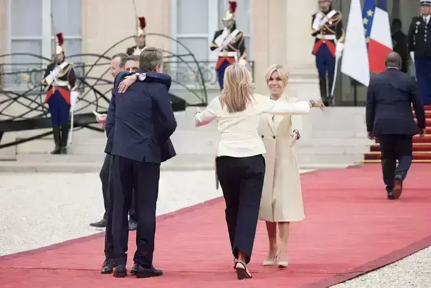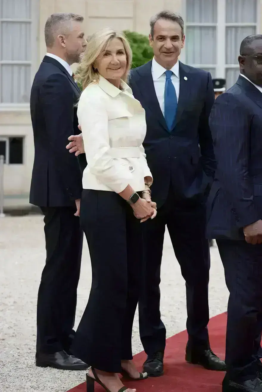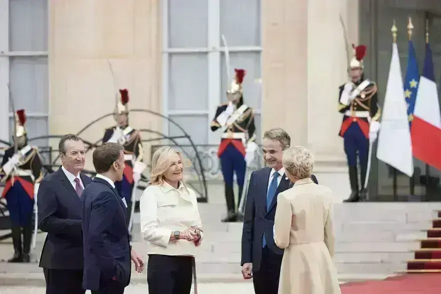 Λίγο πριν τις 5:30 το ζεύγος Κυριάκου Μητσοτάκη και Μαρέβας Γκραμπόφσκι πέρασε την πύλη των Ηλυσίων όπου τους υποδέχτηκε ο Εμανουέλ Μακρόν