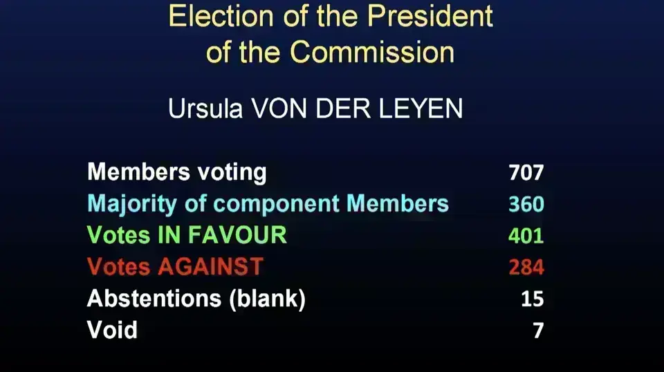 Η Ούρσουλα φον ντερ Λάιεν που πήρε 401 ψήφους θα μείνει στο τιμόνι της Κομισιόν για άλλα 5 χρόνια και θα έχει να αντιμετωπίσει πολλές προκλήσεις. Οι βασικές ευρωομάδες είχαν ανακοινώσει την πρόθεσή τους να την ψηφίσουν και το ερώτημα ήταν κατά πόσον η Φον ντερ Λάιεν θα εξασφάλιζε μια άνετη πλειοψηφία. Η κάλπη έδειξε πλειοψηφία με 401 ψήφους, περισσότερες από τους 361 που χρειαζόταν. Από τα 707 μέλη, υπέρ της Ούρσουλα φον ντερ Λάιεν ψήφισαν 401, κατά ψήφισαν 284, λευκό 15 και 7 ήταν τα άκυρα.