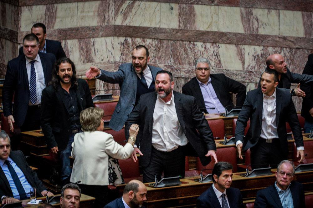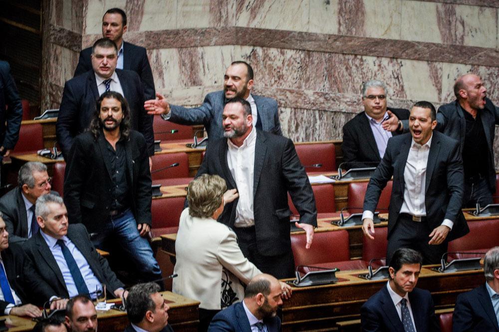 Από τη διαδικασία της ψηφοφορίας δεν έλειψαν οι ασχήμιες. Από τη Χρυσή Αυγή. Εκείνο όμως που έκανε εντύπωση ήταν πως η βουλευτής Χαλκιδικής του κόμματος, Σωτηρία Βλάχου, κατάφερε να συγκρατήσει τον Γιάννη Λαγό όταν έξαλλος και κινήθηκε απειλητικά κατά άλλων βουλευτών.
