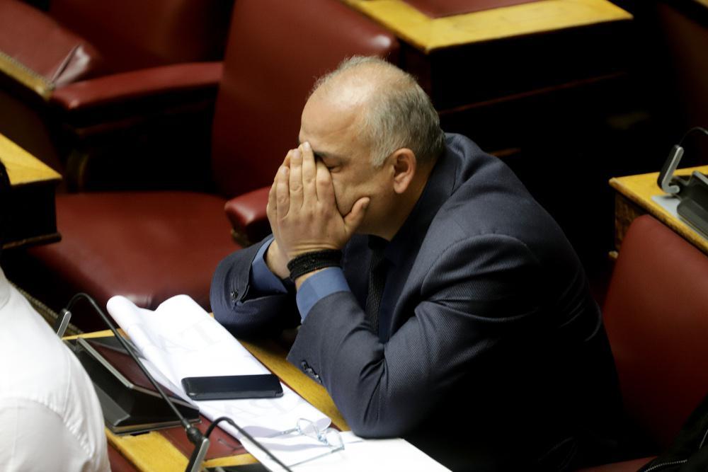 Ο βουλευτής της Ένωσης Κεντρώων, Γιάννης Σαρίδης, πιάνει το κεφάλι του μετά την επικύρωση της Συμφωνίας των Πρεσπών.