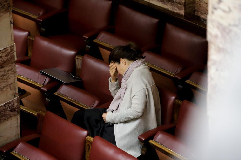 Η βουλευτής της ΝΔ, Γεωργία Μαρτίνου κάθεται μόνη της και πιάνει το κεφάλι της μετά την ψήφιση της Συμφωνίας.