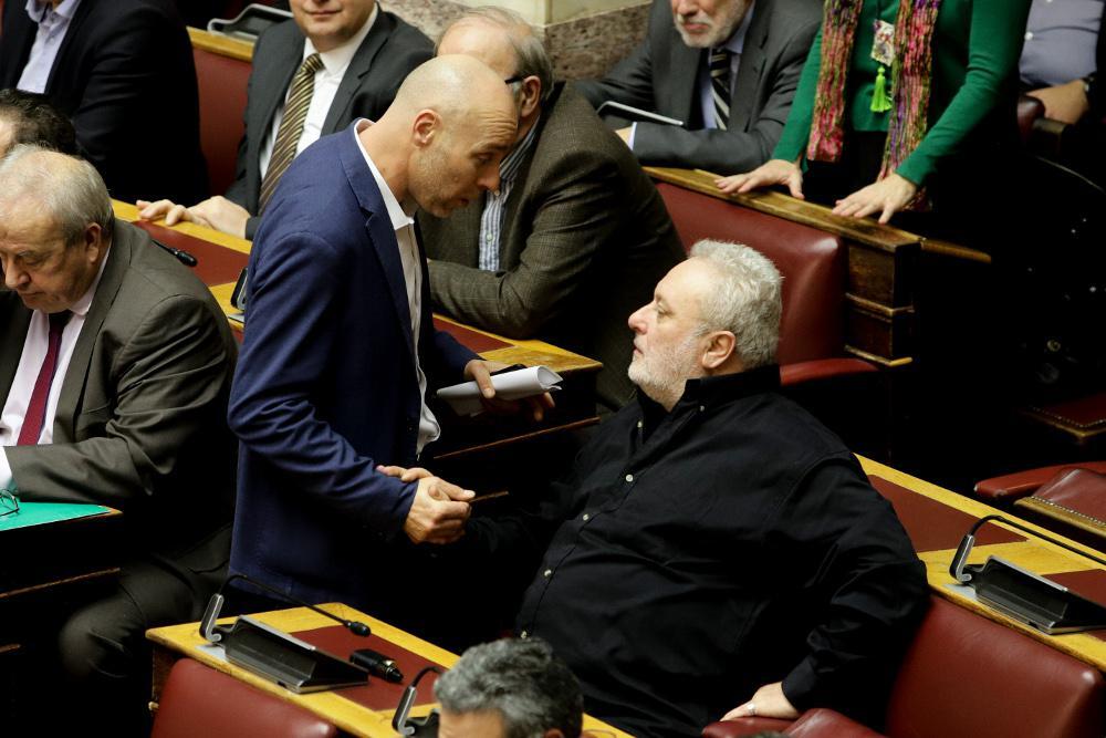 Γιώργος Αμυράς και Γιώργος Ψαριανός συνομιλούν αφότου ψήφισαν κατά συνείδηση στη Συμφωνία των Πρεσπών (ο πρώτος είπε «όχι» και ο δεύτερος επέλεξε το «παρών»)