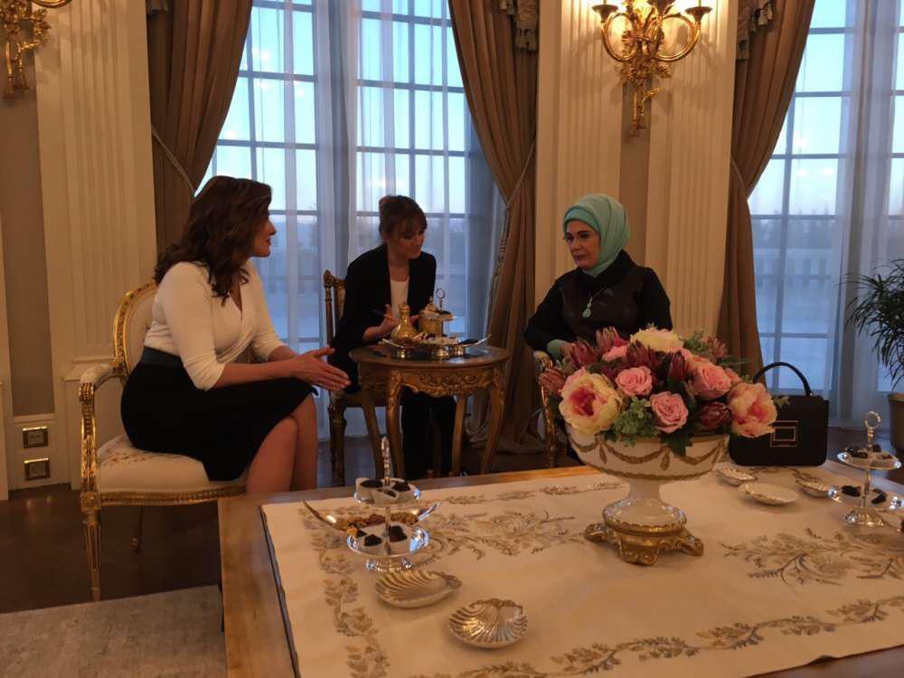 Η σύζυγος του Τούρκου προέδρου προσέφερε τσάι στην Μπέτυ Μπαζιάνα κατά τη συνάντηση τους. Οι δύο κυρίες χαμογελούσαν και συζητούσαν. Μάλιστα, η κυρία Ερντογάν αναμένεται να ξεναγήσει την σύζυγο του πρωθυπουργού στο υπερπολυτελές Λευκό Παλάτι.