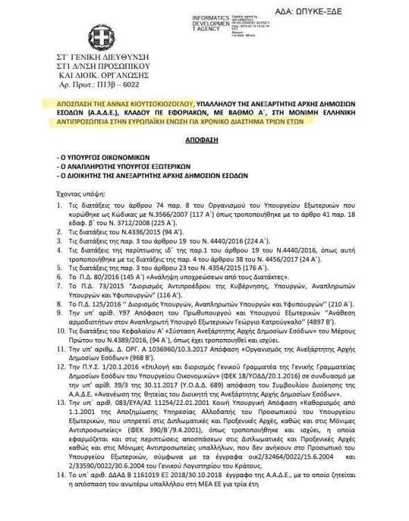 Τα παραπάνω προκύπτουν από το έγγραφο της απόφασης των συναρμοδίων υπουργών και του διοικητή της ΑΑΔΕ, με το οποίο εγκρίνεται η απόσπαση της συνδικαλίστριας εφοριακού. Επιβεβαιώνονται δε και από ένα δεύτερο έγγραφο, την απόφαση του διοικητή της ΑΑΔΕ Γ. Πιτσιλή, για την «ανάληψη πολυετούς υποχρέωσης», βάσει της οποίας προκειμένου η κα Κιουτσοκιόζογλου να πληρώνεται την αποζημίωσή της τα έτη 2020 και 2021 καθώς και τον Ιανουάριο του 2022 δεσμεύονται από τους μελλοντικούς προϋπολογισμούς της Ανεξάρτητης Αρχής πιστώσεις ύψους 61.108,63 ευρώ για το 2020, 61.108,63 ευρώ για το 2021 και 5.092,38 ευρώ για τον Ιανουάριο του 2022.