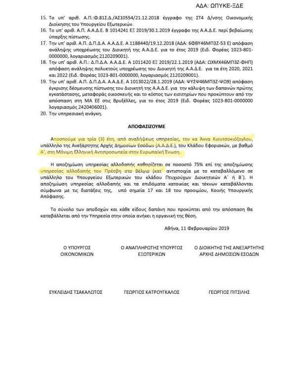Σύμφωνα με τα όσα αποκάλυψε η ιστοσελίδα omadaalithias.gr, με απόφαση του υπουργού Οικονομικών Ε. Τσακαλώτου, του αναπληρωτή υπουργού Εξωτερικών Γ. Κατρούγκαλου και του διοικητή της Ανεξάρτητης Αρχής Δημοσίων Εσόδων Γ. Πιτσιλή, η κ. Κιουτσοκιόζογλου, υπάλληλος της ΔΟΥ Βόλου, αντιπρόεδρος και μέλος του Γενικού Συμβουλίου της Πανελλήνιας Ομοσπονδίας Εργαζομένων στις ΔΟΥ (ΠΟΕ-ΔΟΥ) αποσπάται για χρονική περίοδο τριών ετών, από την 1η-2-2019 έως την 31η-1-2022, στις Βρυξέλλες, στη Μόνιμη Ελληνική Αντιπροσωπεία στην Ευρωπαϊκή Ενωση. Κατά το διάστημα αυτό, δικαιούται να λαμβάνει μηνιαία αποζημίωση υπηρεσίας αλλοδαπής, η οποία ισοδυναμεί με το 75% της αντίστοιχης αποζημίωσης την οποία λαμβάνει ο Ελληνας πρέσβης στο Βέλγιο. Ουσιαστικά, το ακαθάριστο ποσό που αντιστοιχεί στην αποζημίωση της κ. Κιουτσοκιόζογλου και με το οποίο επιβαρύνεται ο προϋπολογισμός της ΑΑΔΕ ανέρχεται περίπου σε 5.100 ευρώ τον μήνα (πάνω από 61.000 ευρώ ετησίως), καθώς η μηνιαία αποζημίωση υπηρεσίας αλλοδαπής του Ελληνα πρέσβη στο Βέλγιο έχει καθοριστεί στα 6.800 ευρώ.