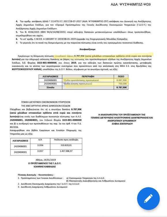 Από ένα τρίτο έγγραφο που παρουσιάζει η ίδια ιστοσελίδα προκύπτει εξάλλου ότι εγκρίθηκε και η διάθεση ποσού 8.787,90 ευρώ από τον φετινό προϋπολογισμό της ΑΑΔΕ για την κάλυψη των εξόδων πρώτης εγκατάστασης, μεταφοράς οικοσκευής και αεροπορικών εισιτηρίων μετάβασης της εφοριακού στις Βρυξέλλες.