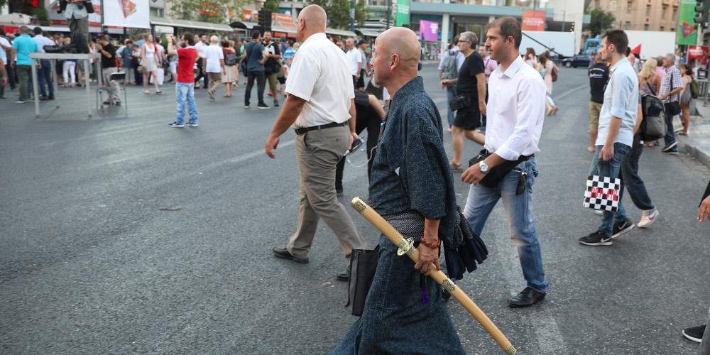Ωστόσο εντύπωση προκάλεσε η εμφάνιση ενός σαμουράι πριν από λίγη ώρα στον χώρο όπου θα γίνει η συγκέντρωση του ΣΥΡΙΖΑ με τους άνδρες ασφαλείας να τον απομακρύνουν άμεσα από το σημείο όπως θα δείτε και στις φωτογραφίες παρακάτω.