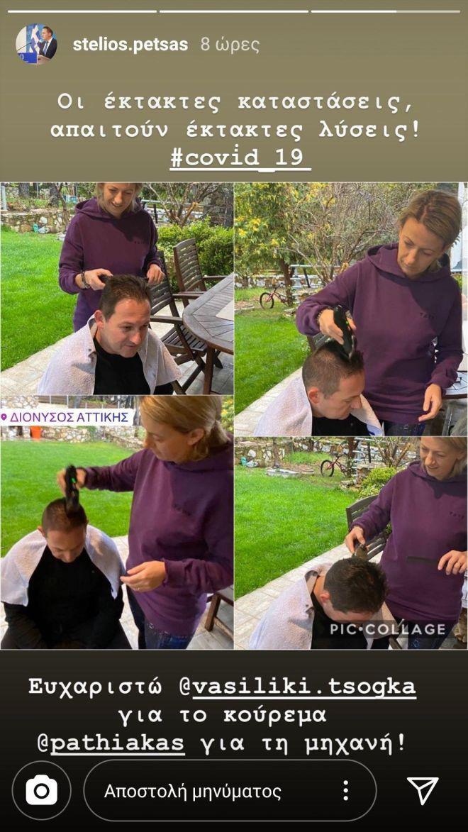 Ο κ. Πέτσας εμπιστεύτηκε τα μαλλιά του στα χέρια της συζύγου του, η οποία τον κούρεψε στην αυλή του σπιτιού τους. Με την ανάρτηση ο κ. Πέτσας ευχαρίστησε την σύζυγό του Βασιλική Τσόγκα για το κούρεμα.