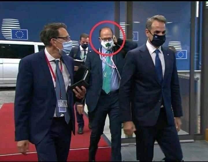 Συγκεκριμένα, η μάσκα που φορούσε κατά την άφιξη της ελληνικής αντιπροσωπείας στη Σύνοδο Κορυφής, είχε επάνω ένα τεράστιο σήμα του συλλόγου.