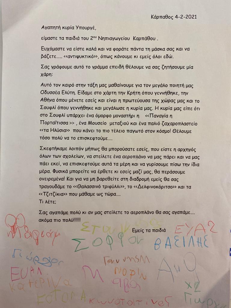 Η πρωτοβουλία για την ψηφιακή συνάντηση των δύο τμημάτων ελήφθη από την Υπουργό, μετά από μία επιστολή που της έστειλαν οι μαθητές του 2ου Νηπιαγωγείου Καρπάθου, με την οποία ζητούσαν να μεσολαβήσει ώστε να μεταφερθούν με… αεροπλάνο στο Σουφλί, όπου έμαθαν ότι υπάρχει ένα ζαχαροπλαστείο «που κάνει το πιο τέλειο παγωτό στον κόσμο»!