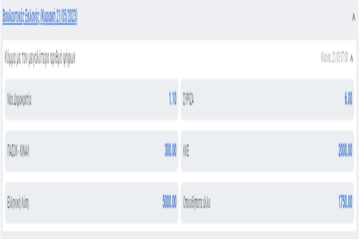 Η πρωτιά ΣΥΡΙΖΑ έχει απόδοση 6 ενώ η πρωτιά του ΠΑΣΟΚ – που θεωρείται εντελώς απίθανη με βάση τα δημοσκοπικά δεδομένα – έχει απόδοση 300. Δηλαδή, αν κάποιος ποντάρει ένα ευρώ, θα βάλει στην τσέπη του 300 ευρώ. Αντίστοιχα, η πρωτιά ΚΚΕ έχει απόδοση 2000 και της Ελληνικής Λύσης 5000.