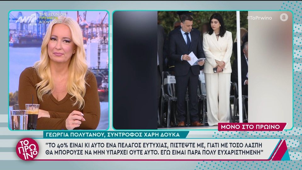 «Όλα ευχάριστα είναι καλέ, γιατί; Συγγνώμη, το 40% είναι κι αυτό ένα πέλαγος ευτυχίας, πιστέψτε με, γιατί με τόσο λάσπη θα μπορούσε να μην υπάρχει ούτε αυτό. Εγώ είμαι πάρα πολύ ευχαριστημένη», είπε αρχικά η Γεωργία Πολυτάνου.