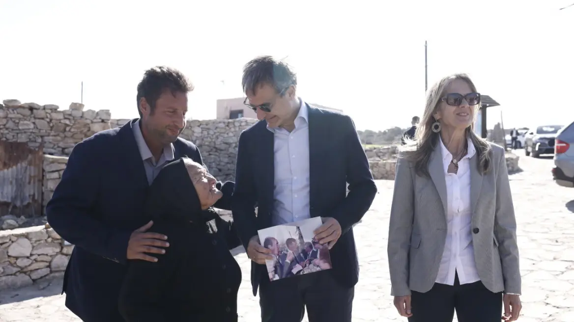 Η γιαγιά κρατώντας μια φωτογραφία με τον Κυριάκο Μητσοτάκη και τον πατέρα του Κωνσταντίνο, πλησίασε τον πρωθυπουργό και τον αγκάλιασε λέγοντάς του πόσο χαρούμενη είναι που έφτασε στο νησί.