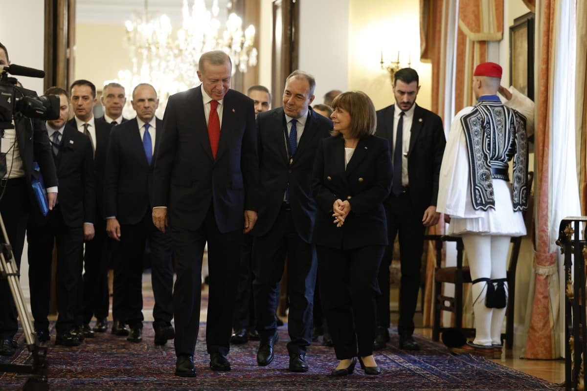 Στο Προεδρικό Μέγαρο που ήταν ο πρώτος σταθμός του κ. Ερντογάν η υποδοχή του από την Κατερίνα Σακελλαροπούλου ήταν εγκάρδια και μάλιστα και σε αυτή την περίπτωση οι Τούρκοι ανέφεραν ότι ο κ. Ερντογάν και η συνοδεία του έμειναν ιδιαιτέρως ευχαριστημένοι και από το ευχαριστώ στα τούρκικα (σ.σ. teşekkür ederim) που του είπε η Πρόεδρος της Δημοκρατίας. Με την είσοδό του ο κ. Ερντογάν έχασε τον δρόμο βαδίζοντας προς τις σκάλες του Προεδρικού Μεγάρου αλλά μετά την παρέμβαση της κυρίας Σακελλαροπούλου επανήλθε στη σωστή πορεία.